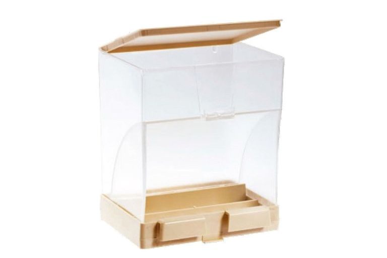 - Mangiatoia Apollo: È una mangiatoia rettangolare da interno per uccelli, realizzata in plastica trasparente, adatta sia a contenere il cibo che l’acqua, con griglia antispreco e comodi ganci che permettono di fissarla facilmente alle maglie orizzontali della vostra voliera.